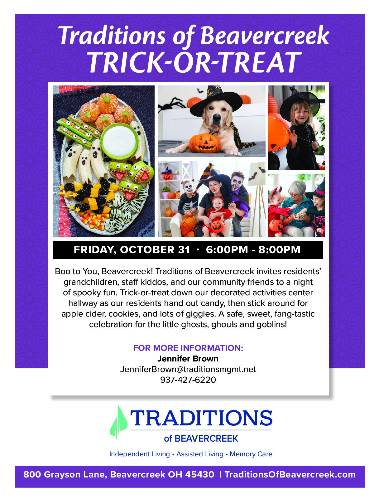 Boo to You, Beavercreek! Traditions of Beavercreek invites residents’ grandchildren, staff kiddos, and our community friends to a night of spooky fun. Trick-or-treat down our decorated activities center hallway as our residents hand out candy, then stick around for apple cider, cookies, and lots of giggles. A safe, sweet, fang-tastic celebration for the little ghosts, ghouls and goblins!