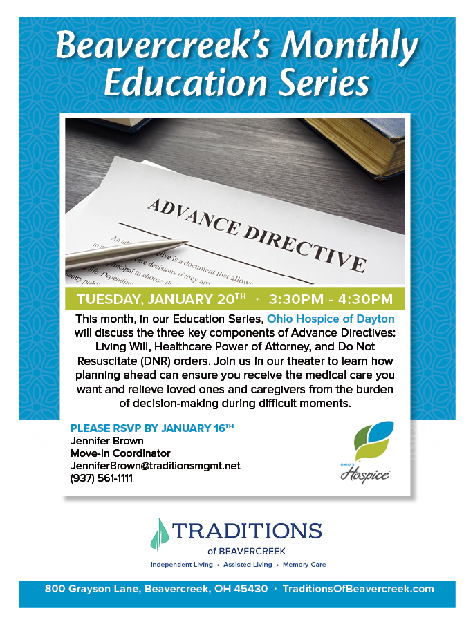 This month, in our Education Series, Ohio Hospice of Dayton will discuss the three key components of Advance Directives: Living Will, Healthcare Power of Attorney, and Do Not Resuscitate (DNR) orders. Join us in our theater to learn how planning ahead can ensure you receive the medical care you want and relieve loved ones and caregivers from the burden of decision-making during difficult moments.